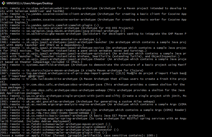 Le processus de création de projet interactif démarre alors et va vous demander le modèle de projet que vous souhaitez utiliser. Nous allons laisser la valeur par défaut correspondant au "maven-archetype-quickstart" (1085 pour moi) et juste appuyer sur Entrée.