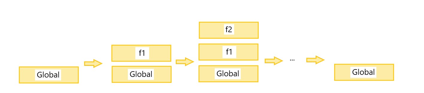 Ainsi, le bas de la pile est le contexte d'exécution global. Chaque fonction appelée dans ce contexte l'interrompt et crée un nouveau contexte d'exécution et ainsi de suite si des fonctions sont appelées dans ce nouveau contexte d'exécution.